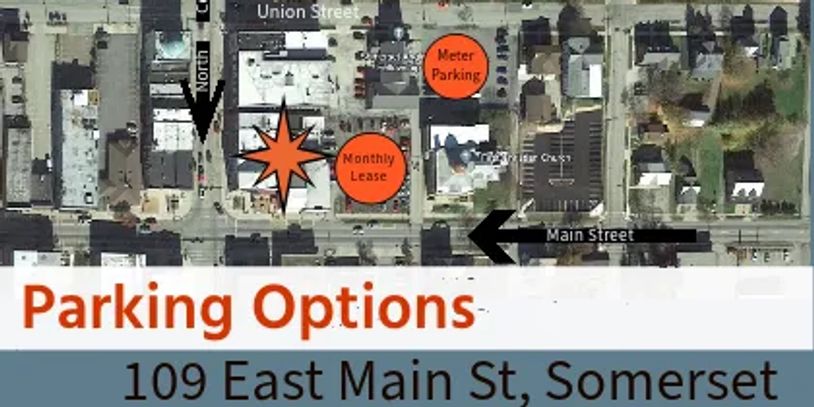 NOTE: RED parking meters are full-day parking meters, and take dimes (yes, dimes) or quarters. Look for red parking meters. There are also gray 2-hour meters. Metered parking is available throughout the business district, a short distance from Uptown Works. Parking leases are available through Uptown Works in the First Christian Church lot, or through the Borough of Somerset.